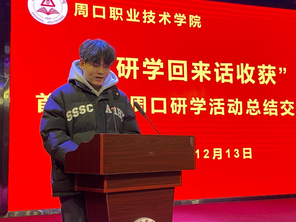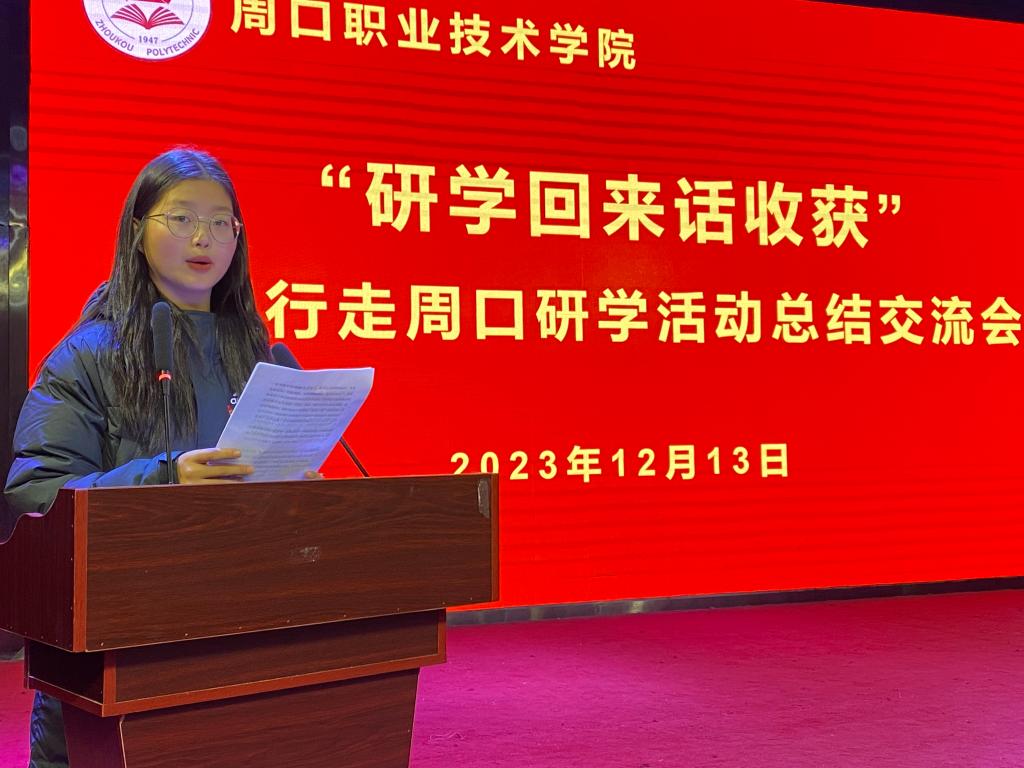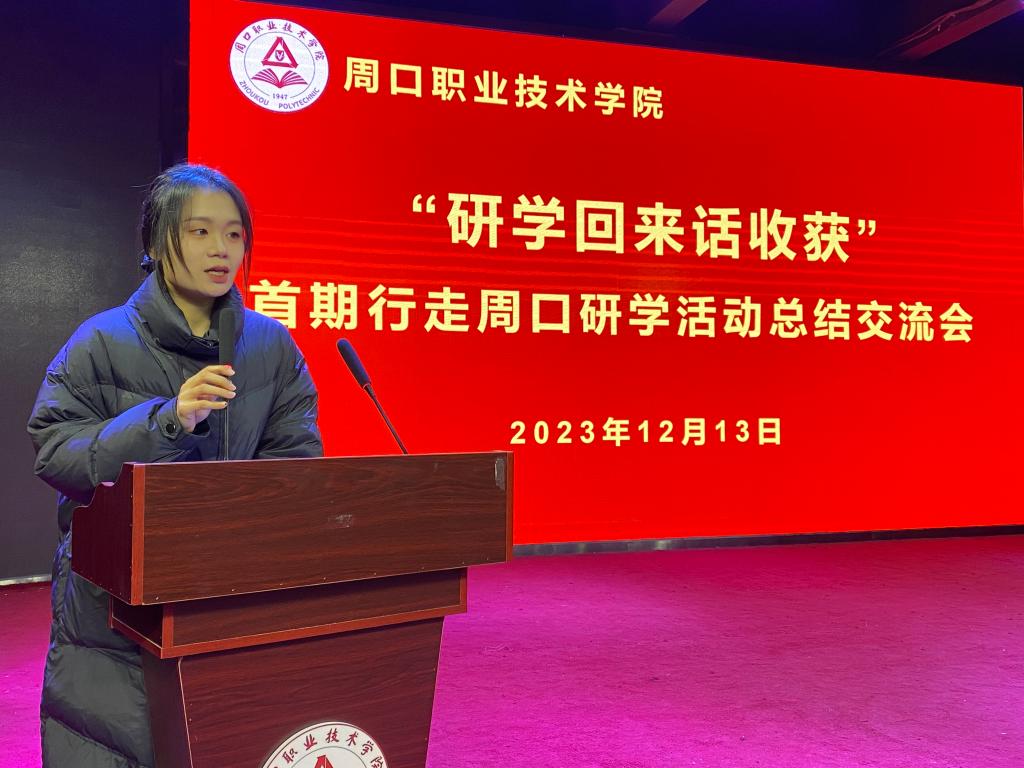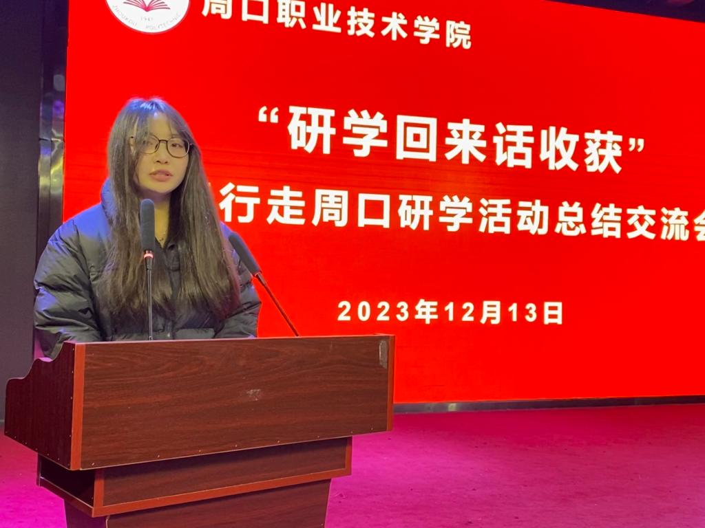 “画外音”辅导员工作室教师代表蔚春抒发言,她讲到,同学们通过徒步周口,探究周口历史,用心去感受周口历史文化底蕴,探索周口人文历史的印记,在研学中开拓视野、增长见闻,给他们的个人成长留下难忘的回忆。希望同学们积极参与研学活动,充分利用好平台,拓展自己的知识面和视野。