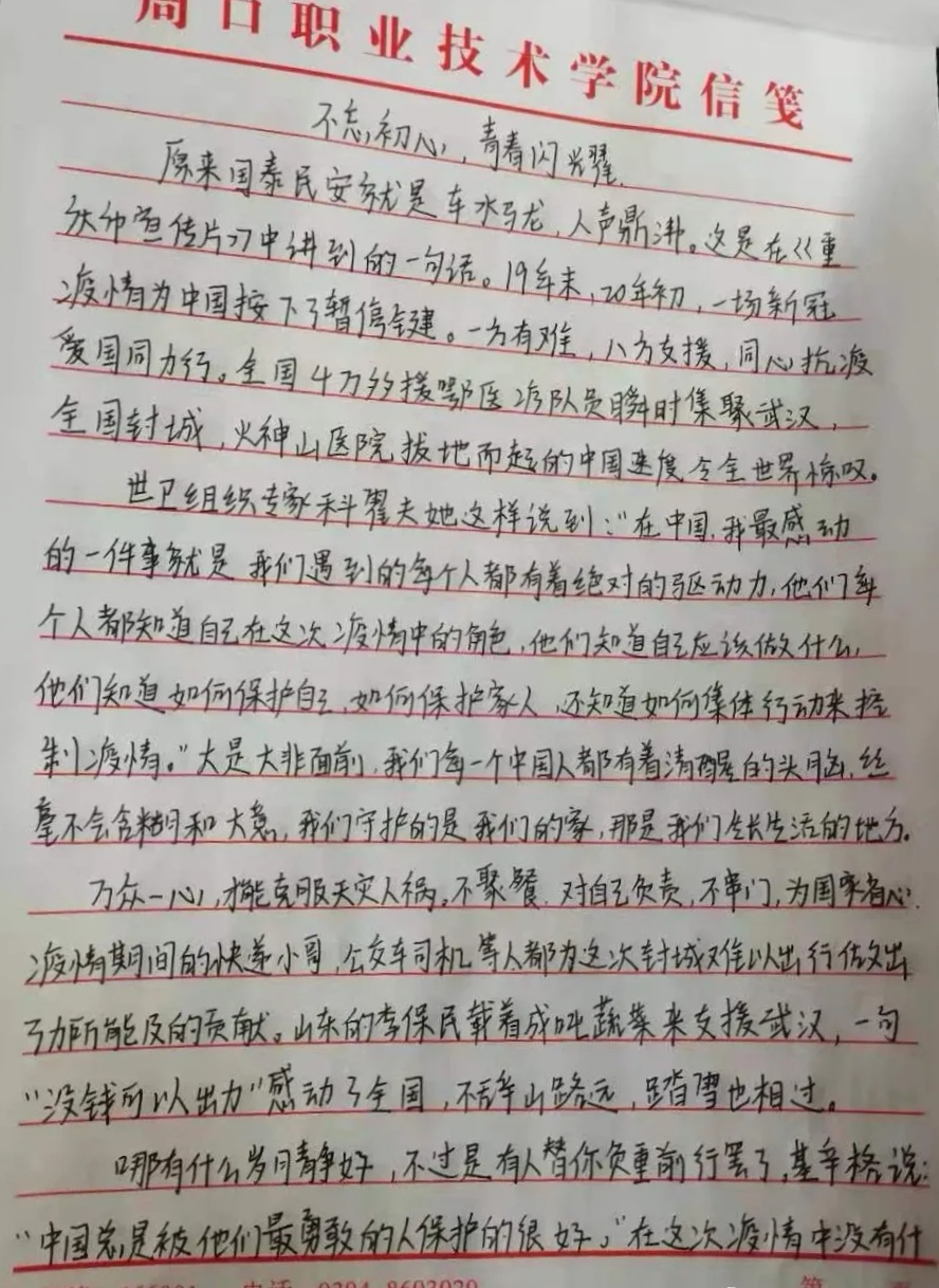 此次征文比赛,厚植了爱国情怀及责任担当,彰显了新时代青年风采,传递了正能量,营造了健康向上的校园文化氛围。