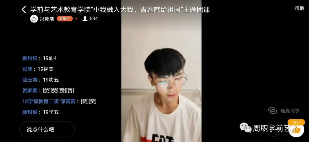 2019级学前教育一班的冯邦浩第一个发言。他说,如今青春正当时,我们要以青春的活力朝气,带动一批又一批的青年学子们!做好接力人,握紧接力棒,走出一片新的天地,为做社会主义的接班人而努力奋斗!