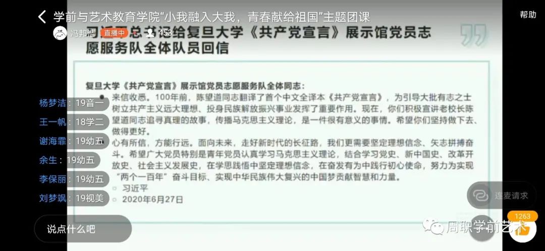 首先,赵晓瑜带领全体同学们共同学习习近平总书记五四寄语、给北京大学援鄂医疗队全体“90后”党员回信、给复旦大学《共产党宣言》展示馆党员志愿服务队全体队员回信、给中国石油大学(北京)克拉玛依校区毕业生回信、给全国青联十三届全委会、全国学联二十七大的贺信精神、“习近平与老员工朋友们”系列访谈实录等。